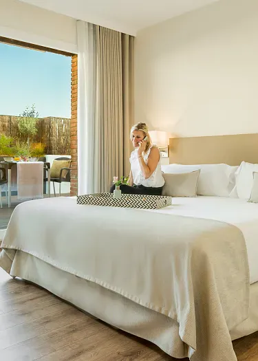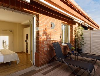 Habitació lluminosa i elegant de 30m2 amb dormitori i sala d'estar, tot en un mateix ambient, bany amb dutxa efecte pluja, terrassa solarium de 30m2, llit matrimonial i TV 49" curved smart full HD. És l'opció més idònia per a aquells vi...
